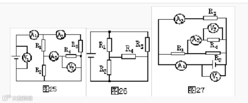 解:先将电流去,用一根导线代摘替,再摘去电压表视为开路,得图26。然后根据图25把电流表和电压表补接到电路中的对应位置上,如图27所示。