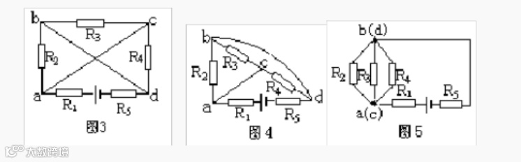 再把连接a、C节点的导线缩成一点,把连接b、d节点的导线也缩成一点,并把R5连到节点d的导线伸长线上(图5)。由此可看出R2、R3与R4并联,再与R1和R5串联,接到电源上。