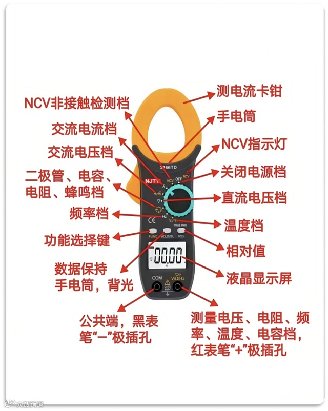 注意:很多钳形表也能测电压,但测电压时要像万用表一样把表笔插好,不要只夹线。