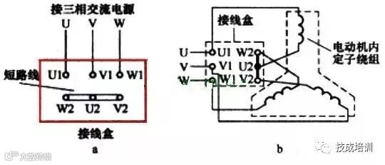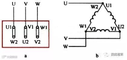 三相异步电动机接线盒有U1、U2、V1、V2、W1、W2工6个接线端,如图1所示。当U2、V2、W2三端连接在一起时,内部绕组就构成了星型连接,如图2所示;当U1、W2、U2和V1、V1、W2两两连接在一起时,内部绕组就构成了三角型连接,如图3所示。若三相电源任意两相之间的电压是380V,当电动机绕组接成星型时,每个绕组上的实际电压值为 380/