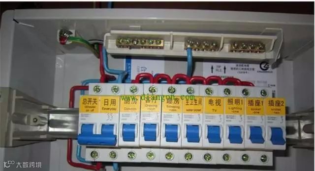 别看这个家用配电盒内开关一堆,实际上这只是使用220V的电压,电源(3根)从上面进来,红色是火线,蓝色是零线,黄绿色是地地线。总开关是只有两个空开组成的,分别通断火线和零线,总开关标签旁边贴的日用标签是错误的,因为总开关中两个空气开关(我们称之为2P开关)之间是联动的,即同开同关,所以贴个日用标签存在误导的情况。