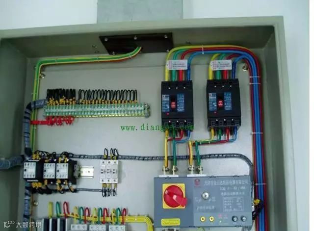 另外这个配电箱还有一个特点,就是使用了双电源自动切换装置(如图右下角所示),它是分别从两个地方引2路三相电源,经过双电源自动切换装置,一般情况下是一路常用,一路备用;当常用的那一路跳闸失电了,装置将自动切换到备用回路,装置下方保持一直有电的状态,从而保证了供电的可靠性。