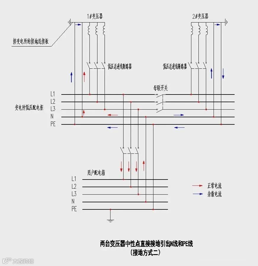通过以上接线图可知,在接地方式二中,用户配电箱的返回电流会在变电所低压配电柜的N线和PE线上分两个路径返回变压器的中性点,其中蓝色箭头所示的就是杂散电流。