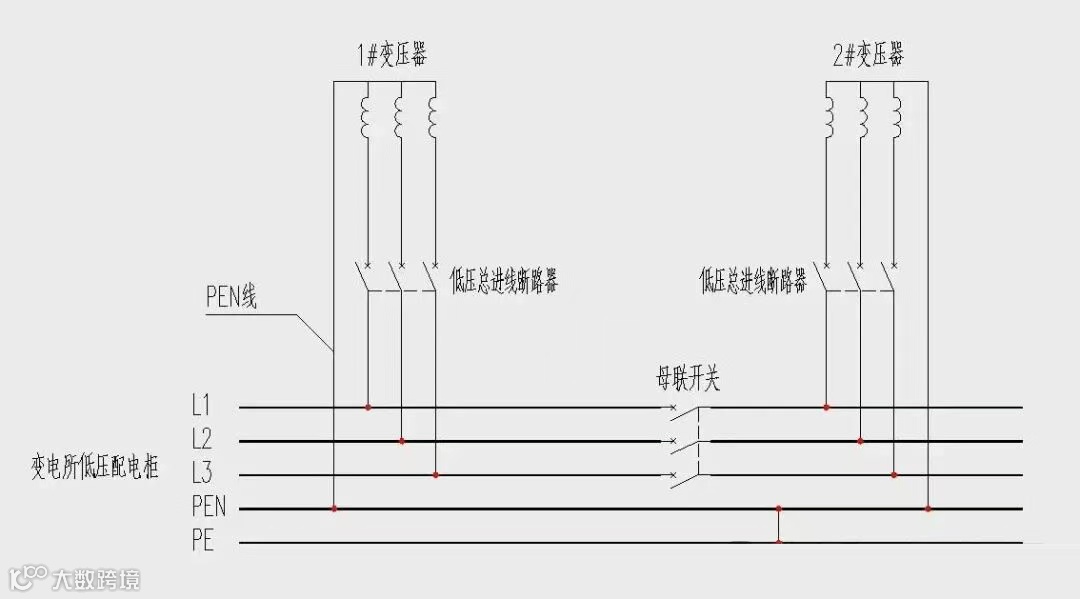 1. 两台变压器中性点引出绝缘PEN线在低压配电柜多点接地(接地方式一)