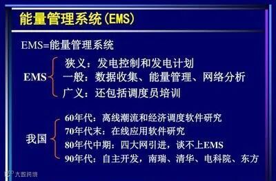 答:EMS能量管理系统是现代电网调度自动化系统(含硬、软件)总称。其主要功能由基础功能和应用功能两个部分组成。基础功能包括:计算机、操作系统和EMS支撑系统。应用功能包括:数据采集与监视(SCADA)、自动发电控制(AGC)与计划、网络应用分析三部分组成。