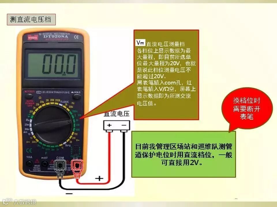3、红表笔探针接触被测电路正端,黑表笔探针接地或 接负端,即与被测线路并联。