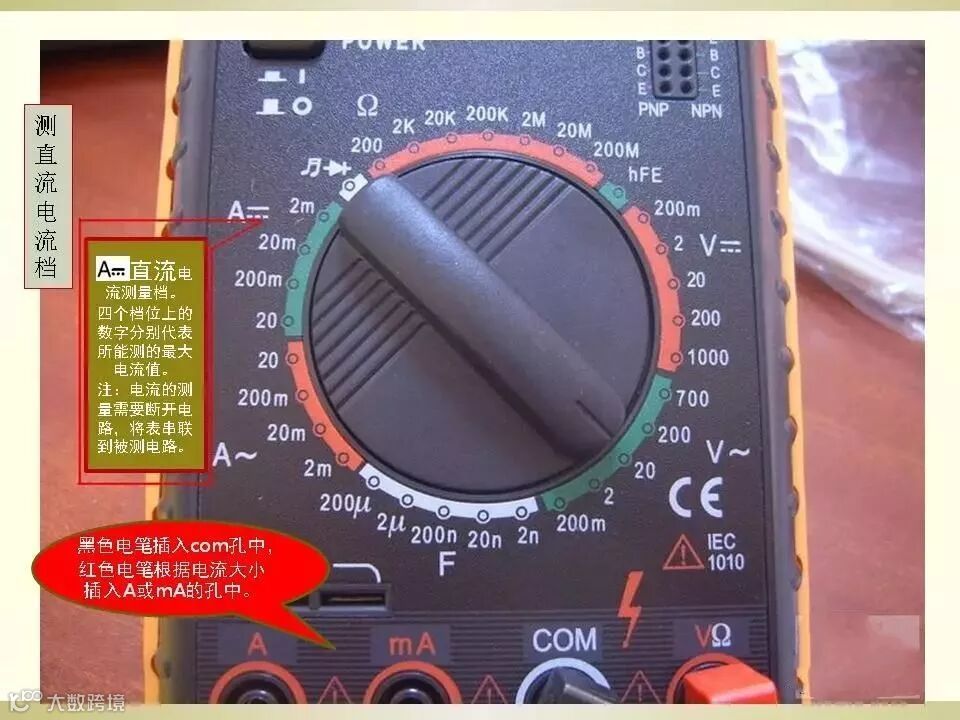 2、黑表笔插入com端口,红表笔插入mA或者20A端口;