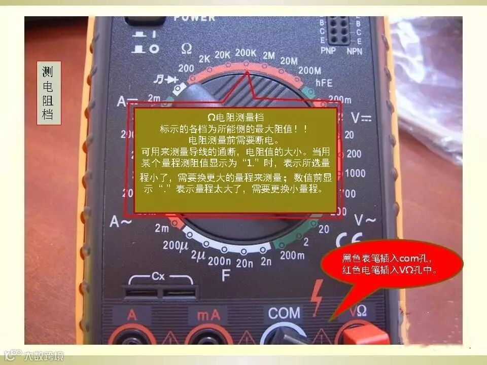 3、 将黑色测试探头插入 COM 输入插口。红色测试探头插入Ω 输入插口。