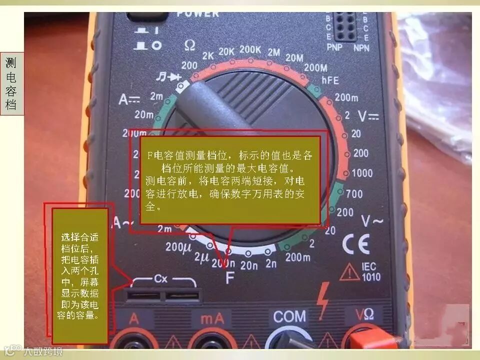 3、将电容插入万用表C-X插孔。