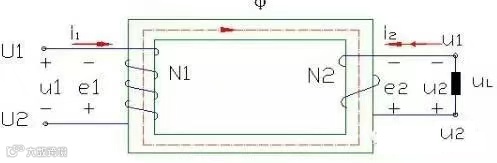 变压器是利用电磁感应原理制成的静止用电器。当变压器的原线圈接在交流电源上时,铁心中便产生交变磁通,交变磁通用φ表示。原、副线圈中的φ是相同的,φ也是简谐函数,表为φ=φmsinωt。由法拉第电磁感应定律可知,原、副线圈中的感应电动势为e1=-N1dφ/dt、e2=-N2dφ/dt。式中N1、N2为原、副线圈的匝数。由图可知U1=-e1,U2=e2(原线圈物理量用下角标1表示,副线圈物理量用下角标2表示),其复有效值为U1=-E1=jN1ωΦ、U2=E2=-jN2ωΦ,令k=N1/N2,称变压器的变比。由上式可得U1/ U2=-N1/N2=-k,即变压器原、副线圈电压有效值之比,等于其匝数比而且原、副线圈电压的位相差为π。