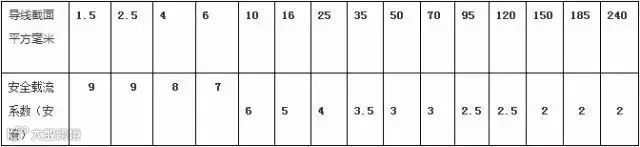 说明:口诀中的二点五下整九倍,升级减一顺序对是指导线截面在2.5平方毫米,每1平方毫米的安全电流为9安培,导线截面从2.5平方毫米以上,即4平方毫米开始线号每增大一等级,其安全电流减小1安培,直至2.5平方毫米为止;三十五线乘以三点五,双双成组减半倍是指导线截面35平方毫米每1平方毫米安全截流量为3.5安培,35平方毫米以上的导线,两个等级的线号为一组,安全电流减0.5安培,依次往上推算;高温九折,铜线升级,裸线加一半,导线穿管二、三、四、八、七、六折勿忘记是指导线穿管两条线应乘系数0.8,导线穿管三条线乘以系数0.7,导线穿管4条线乘以系数0.6。