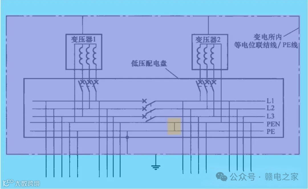 参考《交流电气装置的接地设计规范》GB/T 50065 - 2011 第 7.1.2 - 2 条规定:有多电源的 TN 系统,变压器中性点、发电机星形点别直接接地。电源中性点连接导体和 PE 之间,只在总配电屏内连接一点。