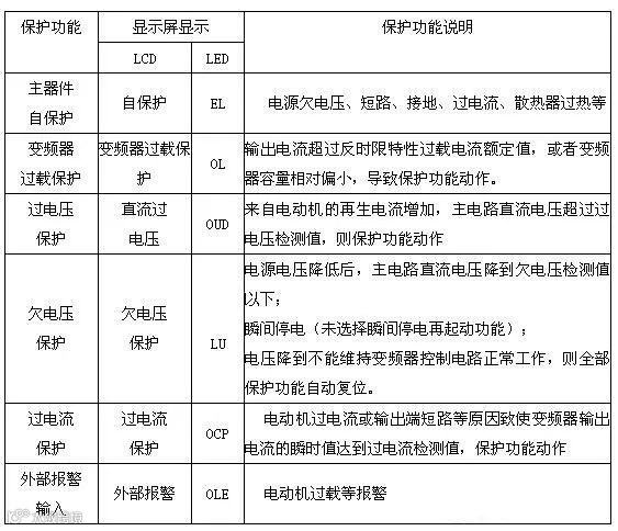 变频器故障时显示的故障名称及保护功能说明见表1。