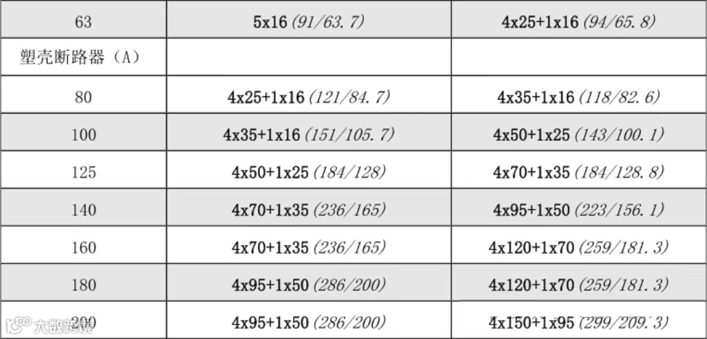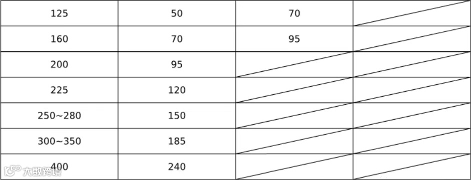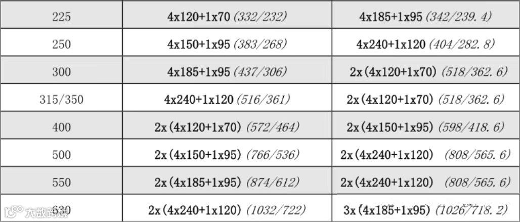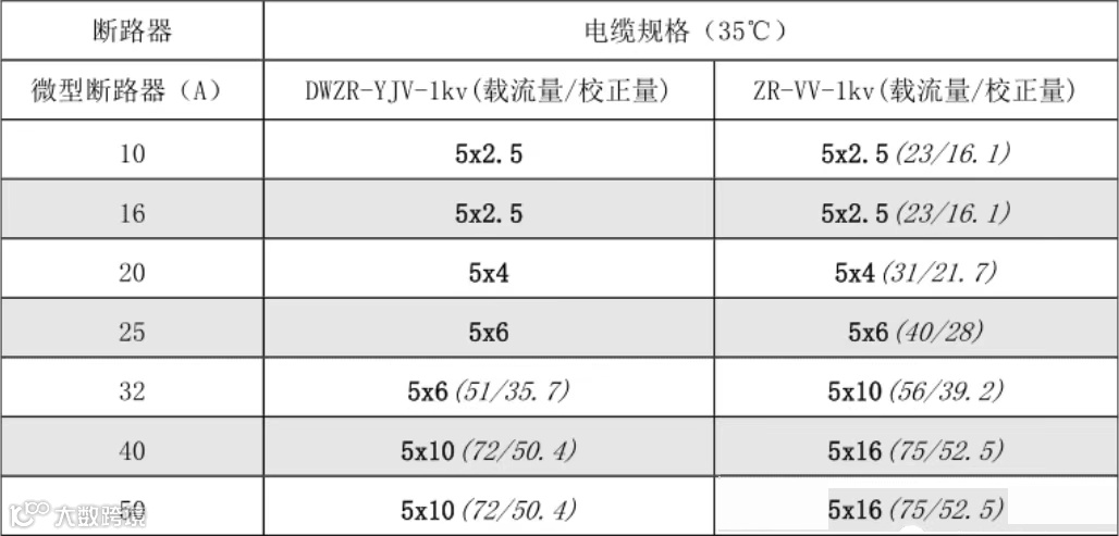 ▲ 补充说明:下表中的电缆载流量数据已按照环境温度 35°C 进行折算,并计入了多根电缆并列敷设于空气中的校正系数(0.7)。
