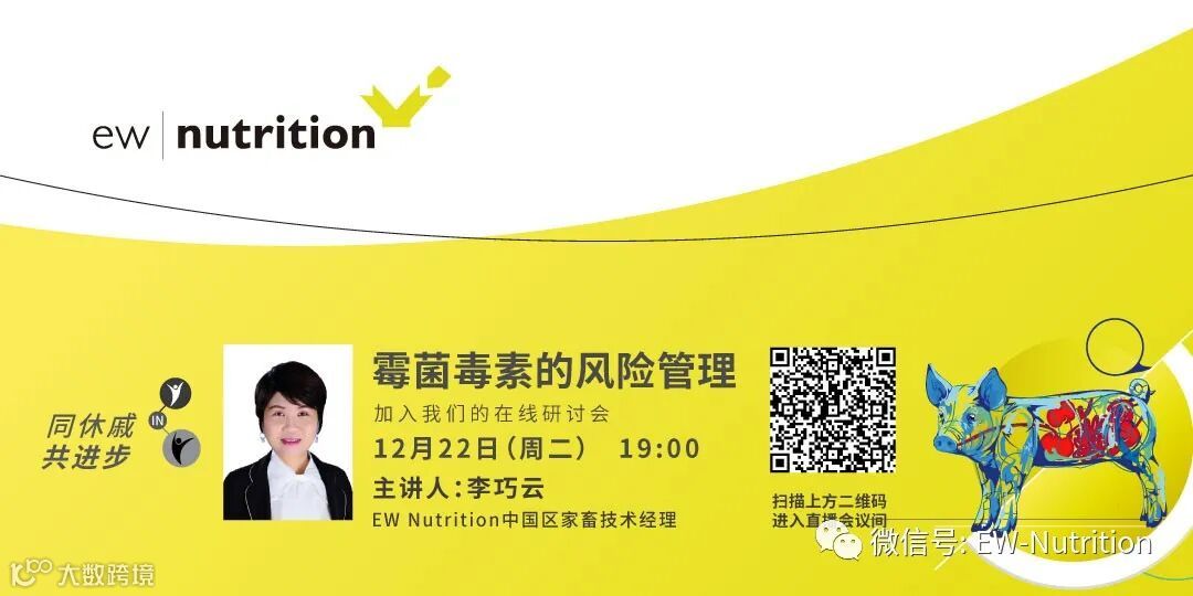 12月22日(周二)19:00将举行第13场名为“霉菌毒素的风险管理"网络研讨会。此次主讲人EW Nutrition中国区家畜技术经理李巧云女士。