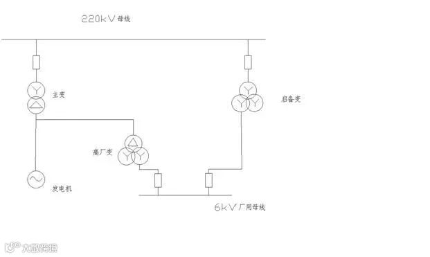 火电厂厂用电,一般接有工作电源和备用电源,机组正常运行时,厂用电由工作电源带(高厂变)。机组停运或者机组刚刚启动,厂用电由备用电源带(启备变)。厂用电一次接线示意图如下: