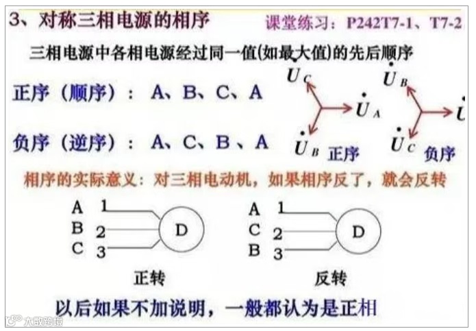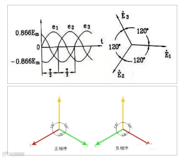 e1比e2超前120°,e2比e3超前120°,而e3又比e1超前120°,称这种相序为正相序或顺相序;反之,如果e1比e3超前120°,e3比e2超前120°,e2比e1超前120°,称这种相序为负相序或逆相序。