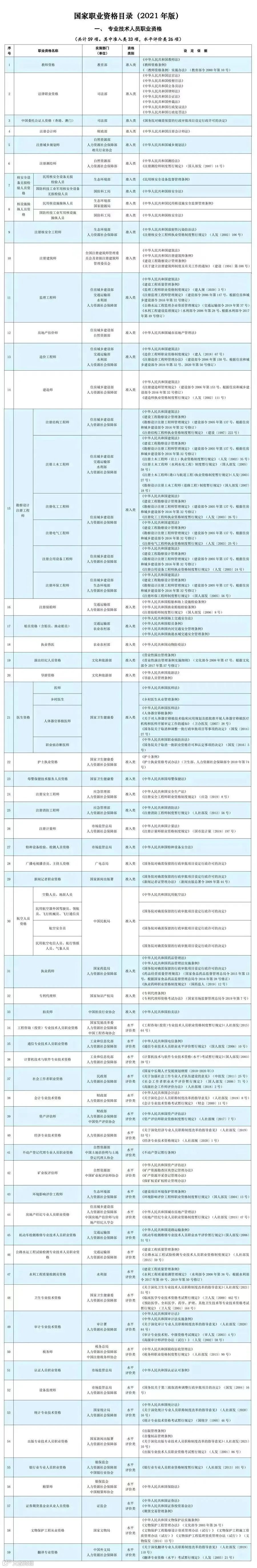 不管大家准备考哪类证书,请认准由人社部发布的《国家职业资格目录》。按照国家职业资格目录,准入类专业技术人员职业资格有33项,准入类技能人员职业资格有13项。