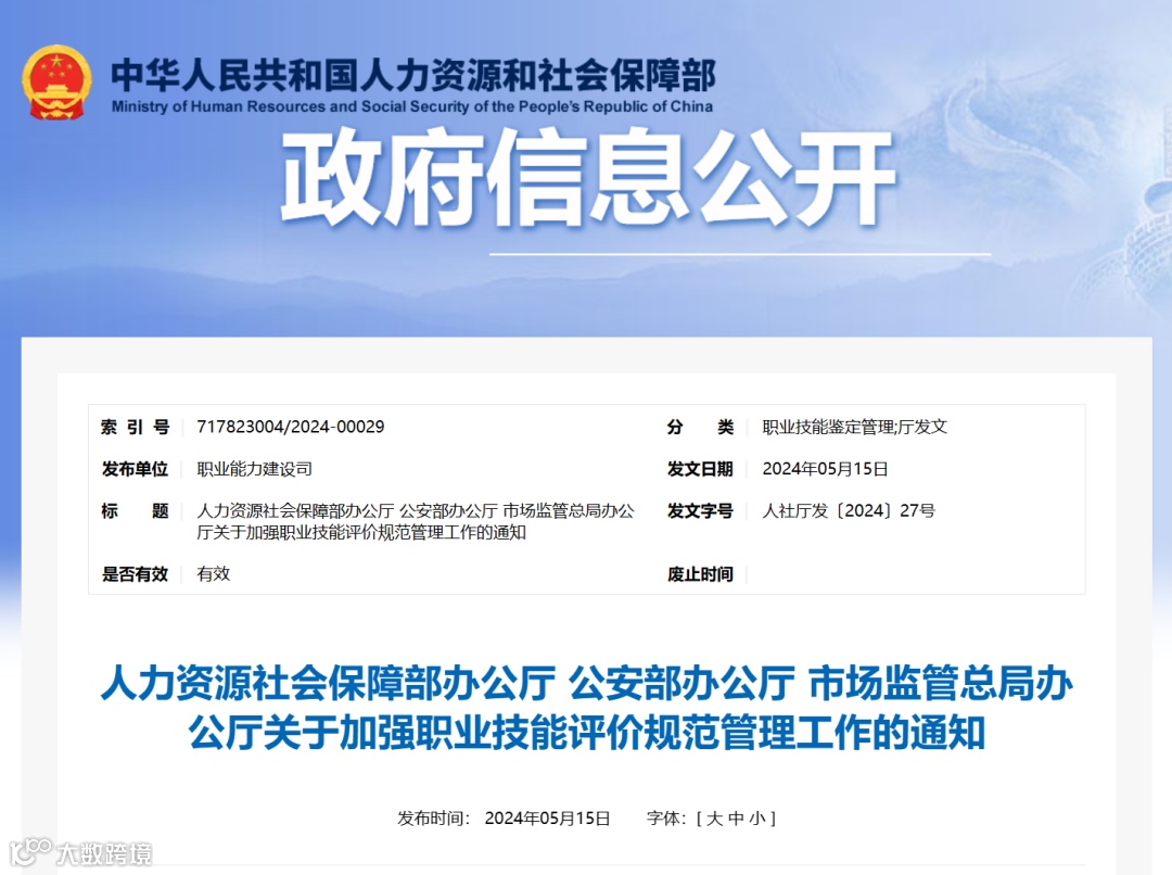5月15日,人社部等3部门联合印发《关于加强职业技能评价规范管理工作的通知》(人社厅发〔2024〕27号)。明确: