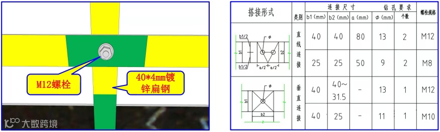 (3)40×4mm与40×4mm接地干线垂直连接时,在扁钢中间位置机械开φ13螺栓孔,用一个M12螺栓紧固联结。