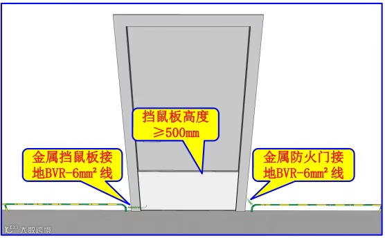 (1)配电室内金属挡鼠板应与接地线可靠连接,接地线规格应为 BVR-1*6m㎡黄绿双色线,挡鼠板高度宜≥500mm。