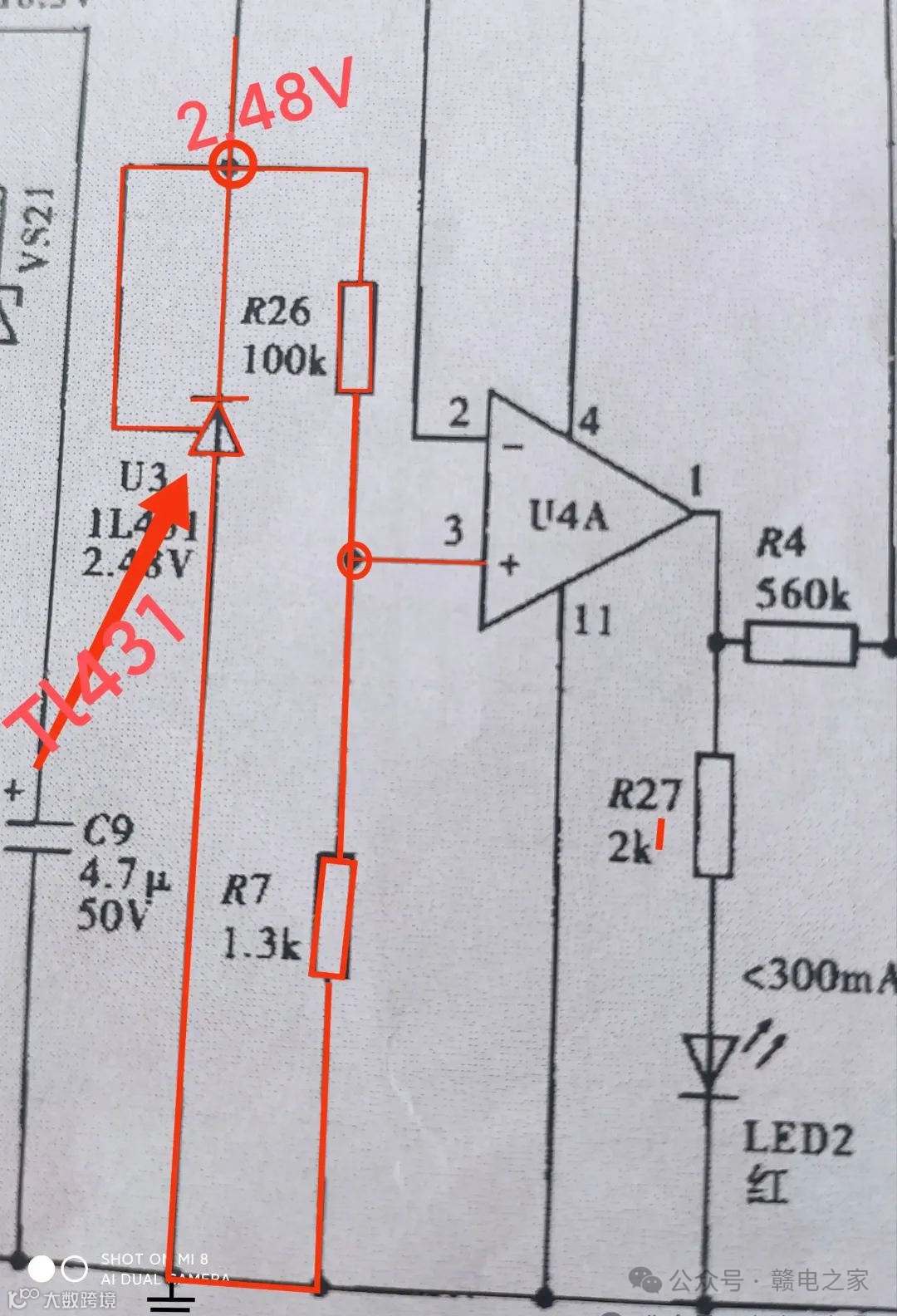 把tl431的阳极(A)接地,参考极(R)与阴极(K)一起接入电路,接入点电压稳定在2.48V,经R26、R7串联分压1.3/(1.3+100)*2.48=0.0318V,给到LM324运算放大器的第3脚(同相输入端)。