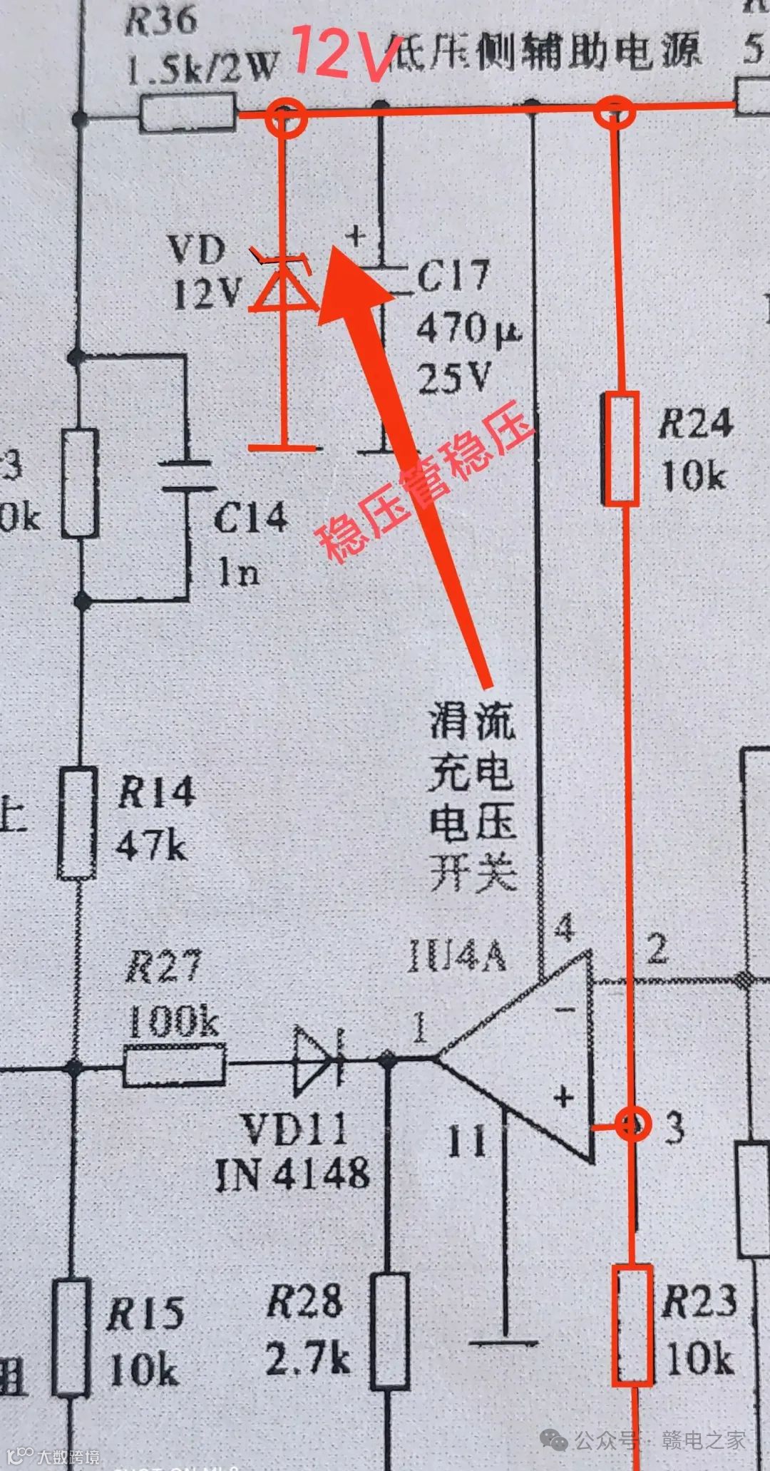 稳压二极管的正极接地,负极所接点被妥妥地稳定在12V,经R24、R23电阻串联分压后得到6V,给到运算放大器的第3脚(同相输入端)。