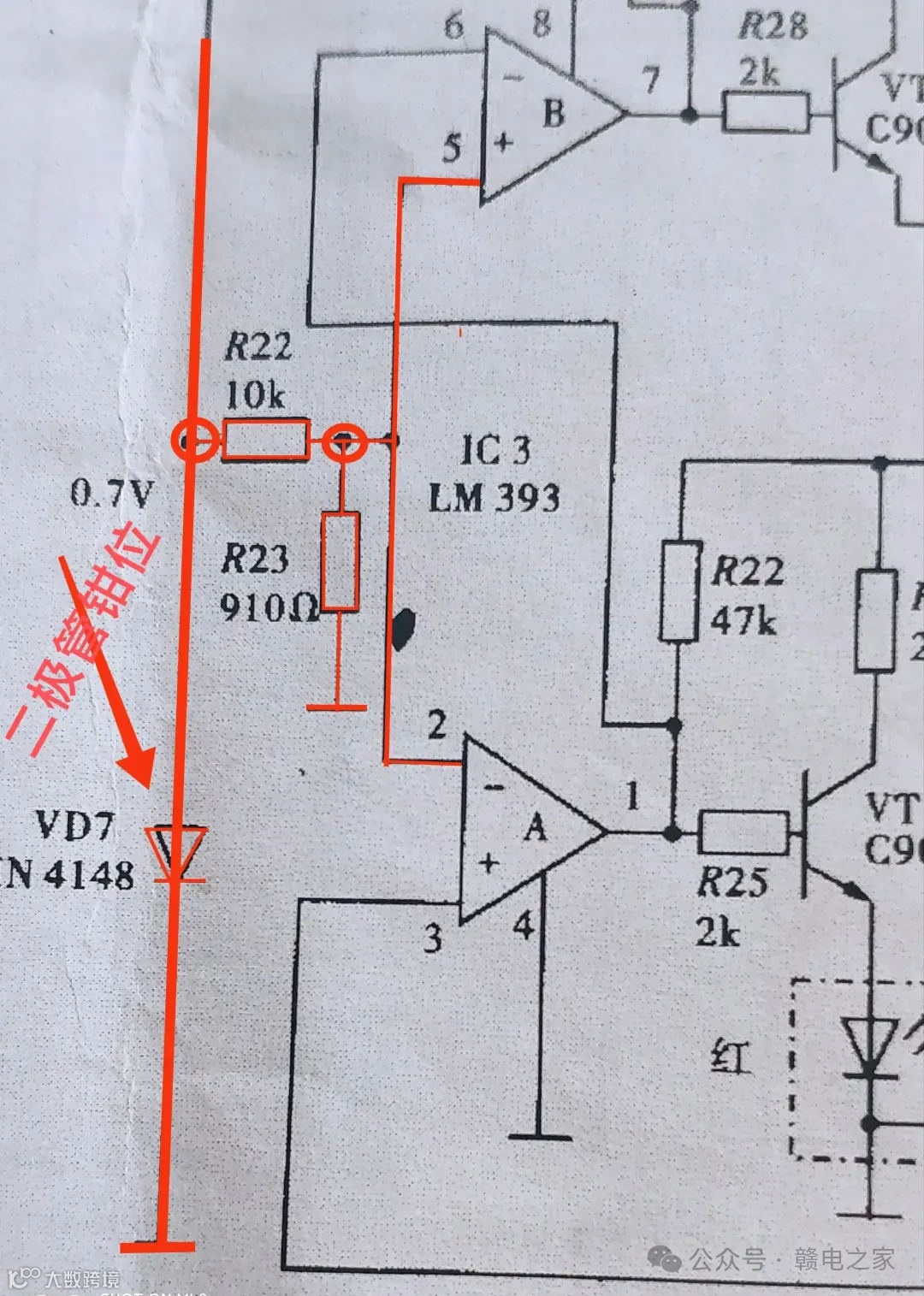 二极管负极接地,正极接入电路,接入点电压被钳位在二极管正向导通压降,各个二极管型号不同,正相导通压降也不同,用时根据型号查其技术手册。1N4148的钳位电压为1V,经R22、R23串联分压,0.91/(0.91+10)*1=0.0834V,给到Lm393的第2脚(反相输入端)。