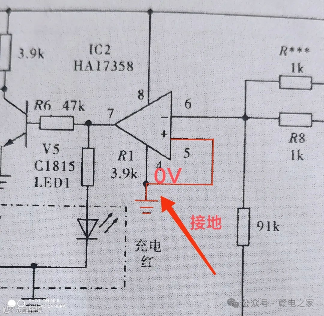 HA17358运算放大器的第5脚(同相输入端)接地,为固定的0V电压。