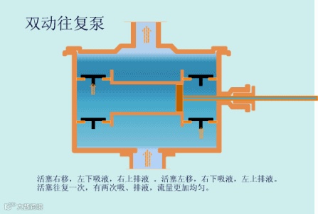 双动往复泵主要由泵缸、活塞、活塞杆、吸入阀、排出阀等部件构成。与单动往复泵不同的是,它的活塞两侧都能起到吸液和排液的作用。在工作时,当活塞向右移动,泵缸左侧空间增大,压力降低,吸入阀打开,液体被吸入左侧空间;与此同时,泵缸右侧空间减小,压力升高,排出阀打开,右侧空间内的液体被排出。而当活塞向左移动时,情况则相反,右侧变为吸入过程,左侧变为排出过程,如此循环往复,实现连续的吸液和排液操作,能较为高效地输送液体。