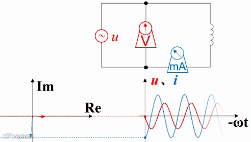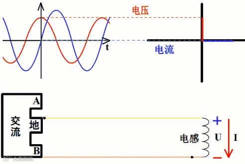 下图是电感的,用红色表示电压,蓝色表示电流。如果接上理想的直流电压表、直流电流表,可以观察到电压的变化超前于电流,电流的变化滞后于电压。时间增加时,纵坐标轴及时间原点会随着波形一起往左移动。