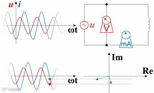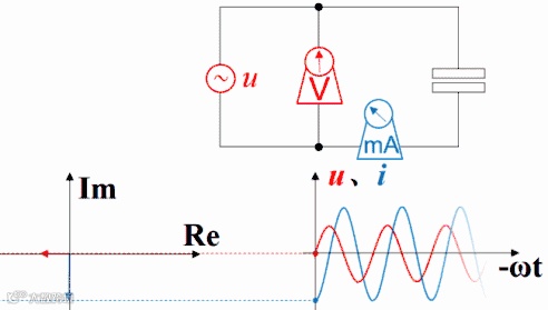 如果把波形画在矢量图右方,就是下面这种动画,但横坐标右方是过去存在的波形,指向过去,是-ωt。虽然波形反过来了,但电压的变化仍然超前于电流,电流的变化仍然滞后于电压。时间原点一直随着波形往右方移动,函数图中的纵坐标轴并未与横坐标交于原点,交点所代表的时间一直在增加。如果不注意,超前滞后的判断很容易出错。
