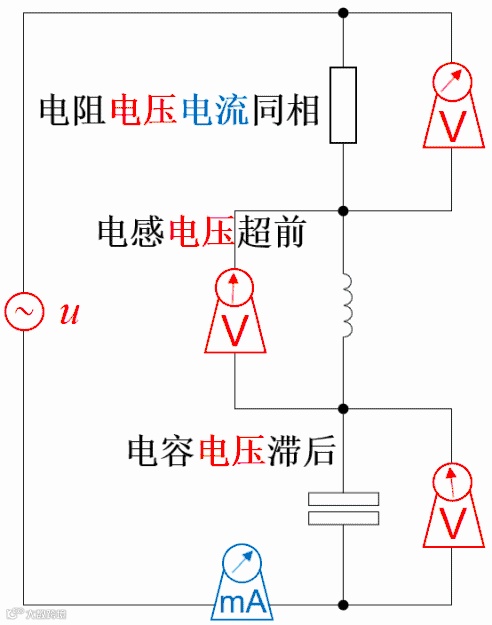 下图是三者串联的情况,没画相量图和波形图。但从指针的变化可以判断:电流相同时,电感和电容的电压函数反相。