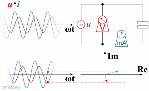 理解超前滞后这一概念用相量图是最好的,从测量数据来观察或者从静态波形上观察都不太直观而且容易出错。下图是电容的。电压的变化滞后于电流,电流的变化超前于电压。坐标系右方是未来,左方是过去。