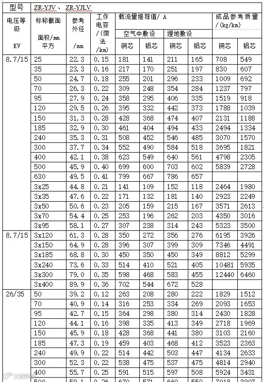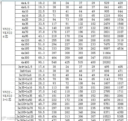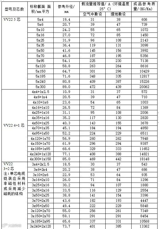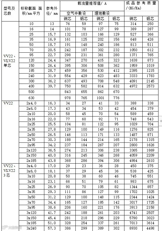 VV22、VLV22型聚氯乙烯绝缘钢带铠装聚氯乙烯护套电力电缆载流量。