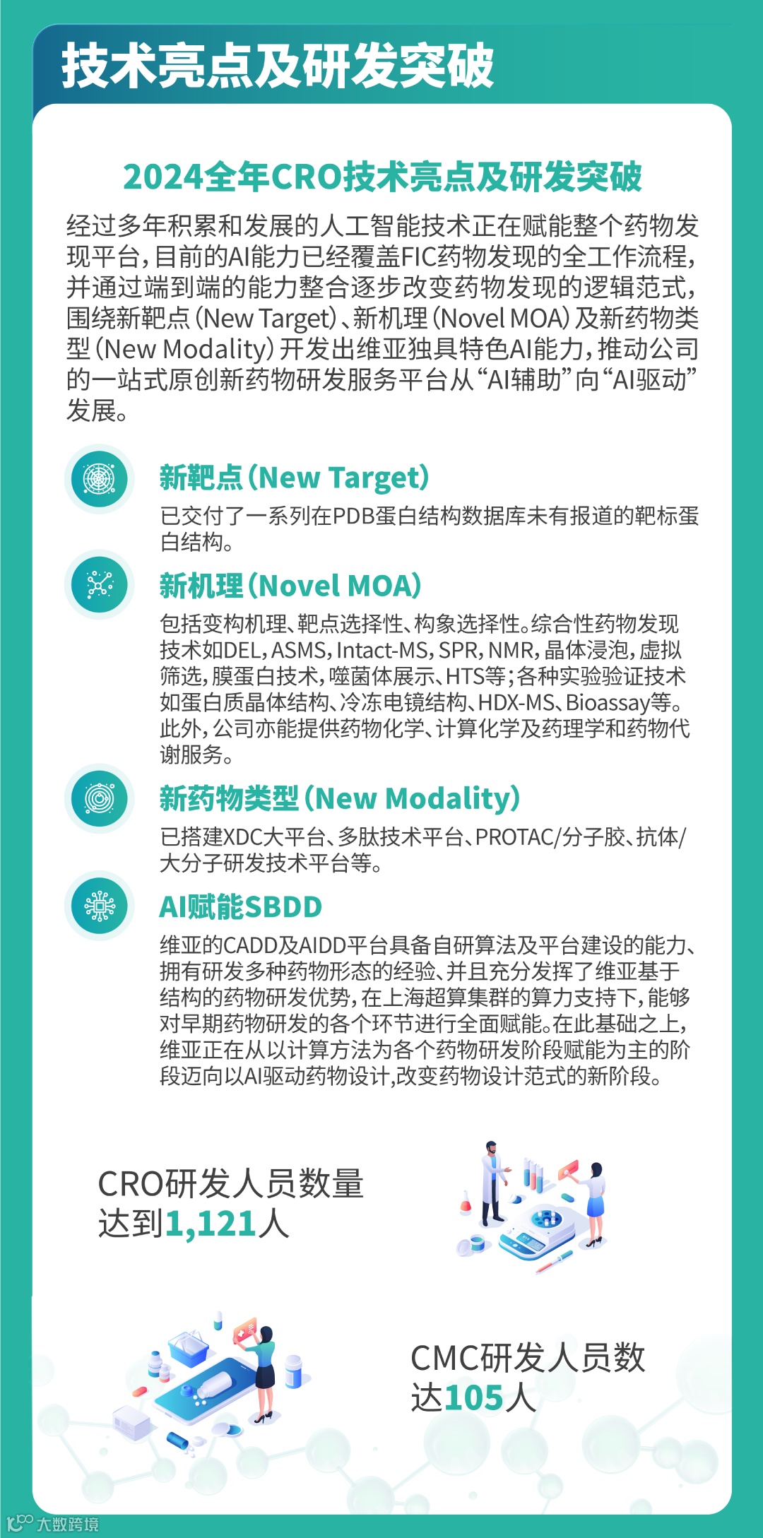 维亚生物(01873. HK)成立于2008年,向全球创新药研发企业提供从早期基于结构的药物研发到商业化药物生产的一站式综合服务。凭借在基于结构的药物研发(SBDD)技术领域的领先优势,我们向全球合作伙伴提供新药研究阶段的CRO服务,搭建了X射线蛋白晶体技术、冷冻电镜技术(Cryo-EM)、DNA编码化合物库技术(DEL)、亲和力质谱筛选技术(ASMS)、表面等离子共振技术(SPR)、氢氘交换质谱技术(HDX-MS)、AIDD/CADD等多个先进技术平台,并有资深药物化学家与药物发现生物专家领军的团队提供药物设计、药物化学(H2L,LO)、化合物合成、化学分析及纯化、公斤级放大及多肽合成及相应的生物活性测试服务。通过子公司朗华制药,我们提供从临床前开发到商业化生产的一站式CMC/CDMO解决方案。同时,我们专注于发现、投资高潜力生物医药初创公司,以独创的技术服务换取股权(EFS)的商业模式,解决未满足的临床需求。