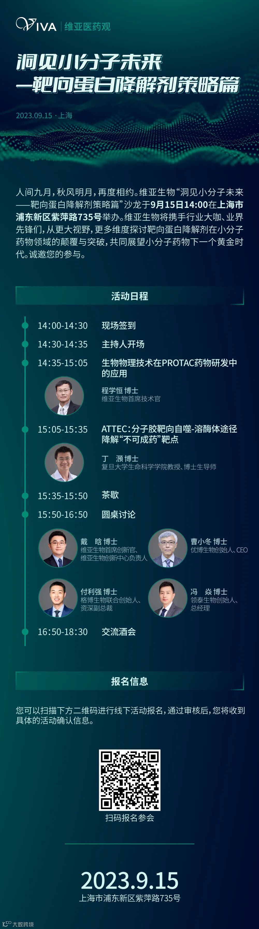 2023年9月15日,维亚生物将举办“洞见小分子未来——靶向蛋白降解剂策略篇”沙龙,携手行业大咖、业界先锋们,从更大视野,更多维度探讨靶向蛋白降解剂在小分子药物领域的颠覆与突破,共同展望小分子药物下一个黄金时代。