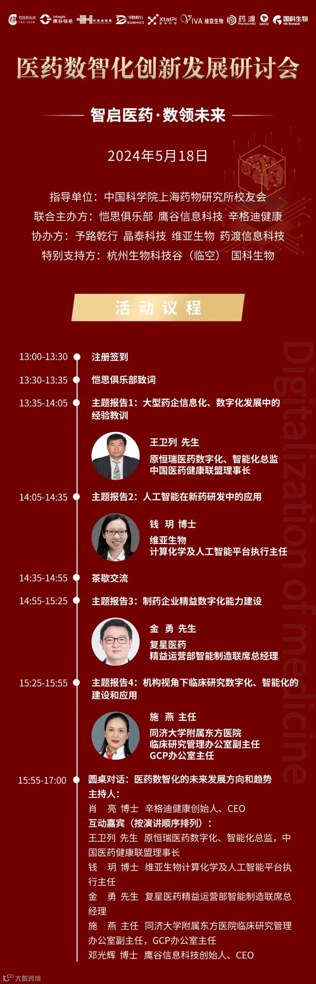 本次研讨会旨在汇聚业界精英,共同探讨医药数智化创新发展的前沿趋势与实践经验。我们相信,通过深入的交流与探讨,将为大家带来全新的启示与收获,共同推动医药行业的数智化转型与升级