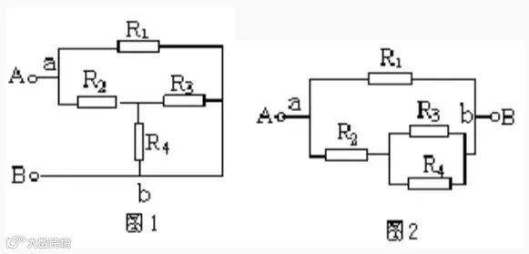 解:设电流由 A 端流入,在 a 点分叉,b 点汇合,由 B 端流出。支路 a—R1—b 和 a—R2—R3(R4)—b 各点电势逐次降低,两条支路的 a、b 两点之间电压相等,故知 R3 和 R4 并联后与 R2 串联,再与 R1 并联,等效电路如图 2 所示。