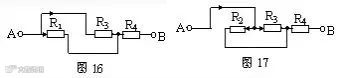 举例:仍以图 13 为例,设电流由 A 端流入,B 端流出,先撤去 R2,由图 16 可知 R1、R3 有电流通过。再撤去电阻 R1,由图 17 可知 R2、R3 仍有电流通过。同理撤去电阻 R3 时,R1、R2 也有电流通过由并联电路的特点可知,R1、R2 和 R3 并联,再与 R4 串联。