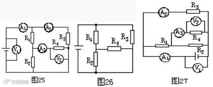 解:先将电流去,用一根导线代摘替,再摘去电压表视为开路,得图 26。然后根据图 25 把电流表和电压表补接到电路中的对应位置上,如图 27 所示。