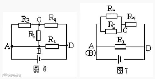 解:电流从电源正极流出过 A 点分为三路(AB 导线可缩为一点),经外电路巡行一周,由 D 点流入电源负极。第一路经 R1 直达 D 点,第二路经 R2 到达 C 点,第三路经 R3 也到达 C 点,显然 R2 和 R3 接联在 AC 两点之间为并联。二、三路电流同汇于 c 点经 R4 到达 D 点,可知 R2、R3 并联后与 R4 串联,再与 R1 并联,如图 7 所示。