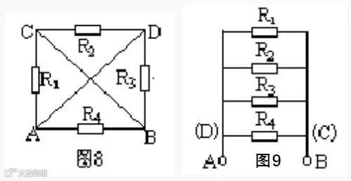 举例:如图 8 所示,已知 R1 = R2 = R3 = R4 = 2Ω ,求 A、B 两点间的总电阻。