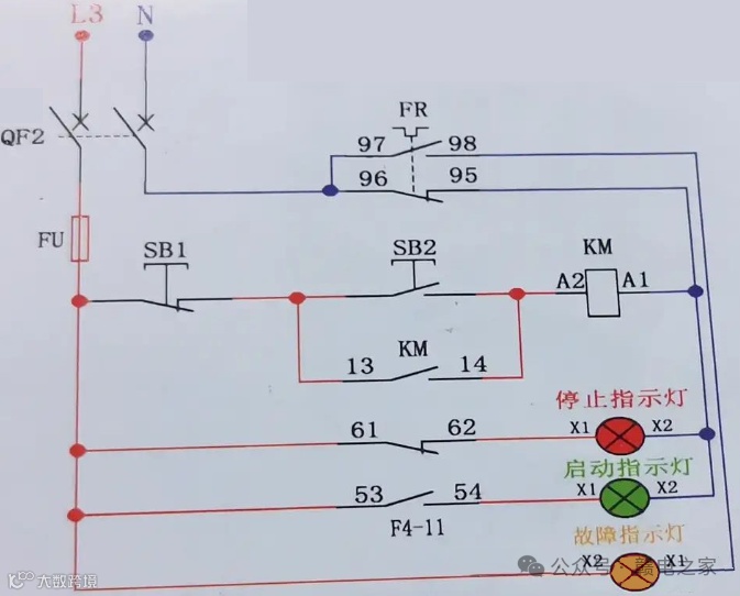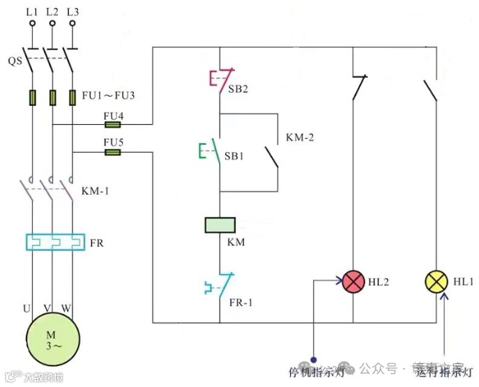 停止信号指示灯反映设备处于停机状态,一般也用红色显示,指示灯一端接在接触器的辅助常闭触点,另一端接零或接另一相线,当接触器吸合设备运行时其辅助常闭触点断开,指示灯回路断开,灯不亮,当接触器没有吸合设备停机时,其辅助常闭触点导通,灯回路接通,灯亮,如上图停止指示灯HL2。