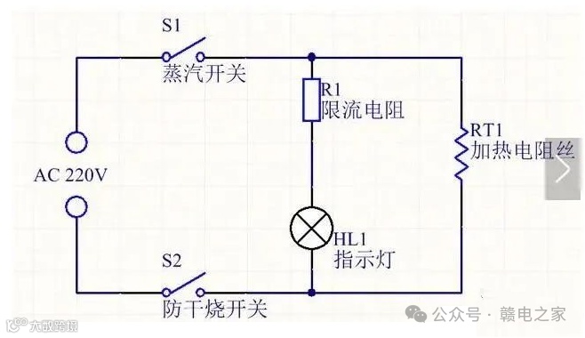 指示灯直接和设备(负载)并联,直接体现设备的工作状态,如下图电热水器电路图,指示灯HL1直接和负载RT1并联: