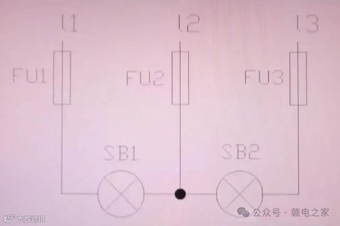(2)三相V形接法。如下图,指示灯的额定电压为380V,这种接法应用较多,但L2缺相时两个指示灯的亮度将变暗;