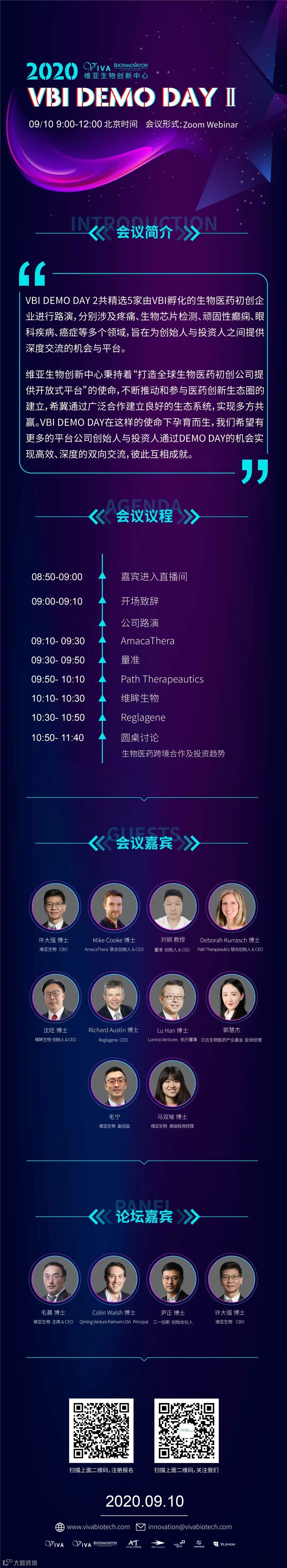 中国,上海——维亚生物创新中心(VBI)将于2020年9月10日举办Demo Day 2活动,本次活动将以ZOOM线上直播的形式举办,时间为上午9:00-12:00(北京时间)。