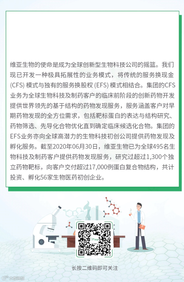 维亚生物作为全球领先的基于结构的药物发现平台,为全球生物科技及制药客户的临床前阶段的创新药物开发提供先进的基于结构的药物发现服务,涵盖客户对早期药物发现的全方位需求。截止到2020年6月30日,本公司已为全球495名生物科技及制药客户提供药物发现服务,并通过EFS(服务换股权)模式累计投资孵化全球56家生物医药初创企业,囊括多种适应症和前沿医学领域,作用机制广泛。维亚生物致力于成为全球创新型生物科技公司的摇篮,并持续通过战略合作、并购等方式积极构建综合的一站式药物服务平台。