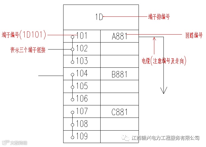 3)端子排(左右两侧相通)。端子排在图纸中起到至关重要的作用,会看懂端子排是看懂二次回路的前提,端子排以下举例: