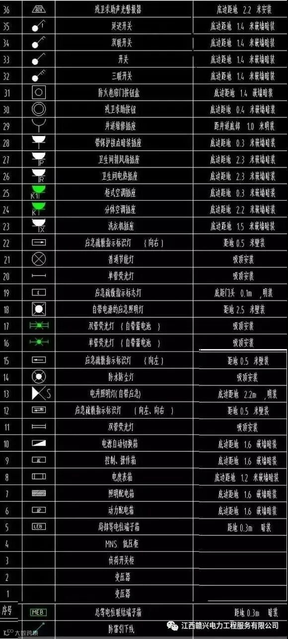 建筑电气图例中,插座的分类一般用字母来代替,比如普通插座旁多了一个字母R,则用来表示热水器插座。上图中,左边图例,右边为相对应的安装高度。